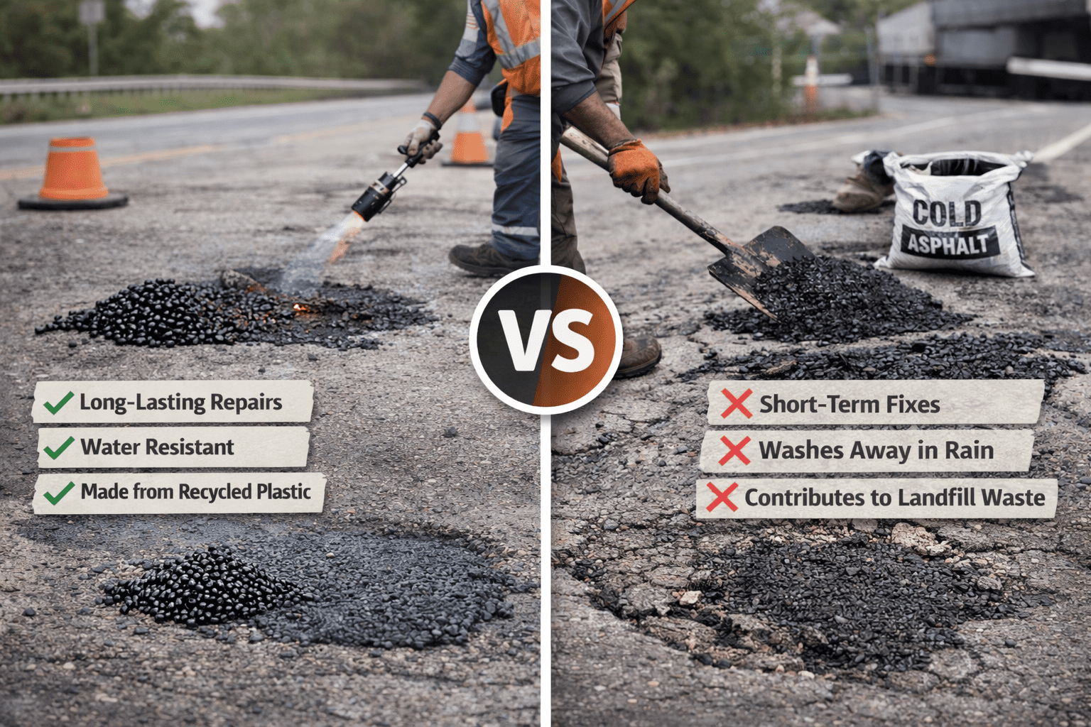 Cold mix asphalt bags are widely used for pothole repairs because they are easy to apply. However, these repairs often provide only temporary fixes and may wash away during rainfall or heavy traffic.
